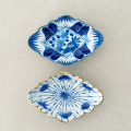 菊の花をイメージした菱型の白磁に、手描きで染付けを施した有田焼の器。