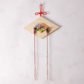 扇には極彩色の蓬莱図を手書きし、縁起のよい松・梅・橘の造花も添えています。