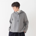 顔まわりを優しく包み込むフードと、アシンメトリーな前合わせが魅力のコート。