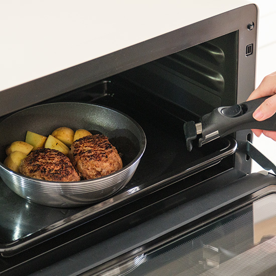 取っ手を外せばオーブンにも使え、熱々をそのまま食卓に出せます。