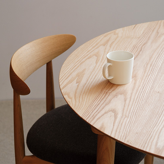 生き生きした木の表情が楽しめる、国産タモ材の丸テーブルをご紹介します。