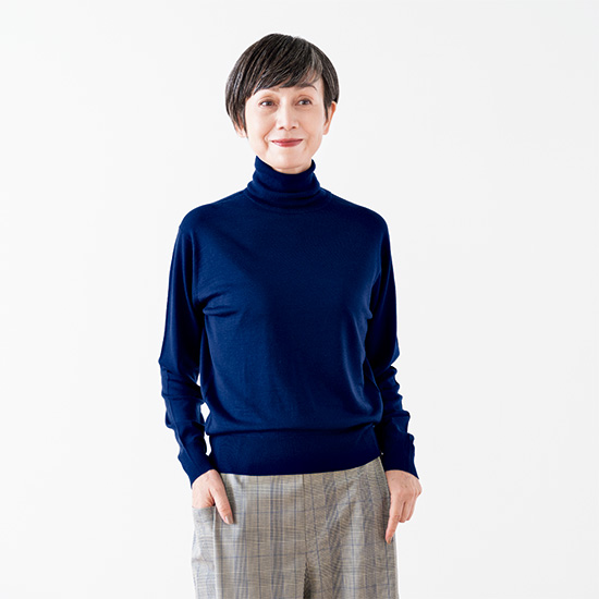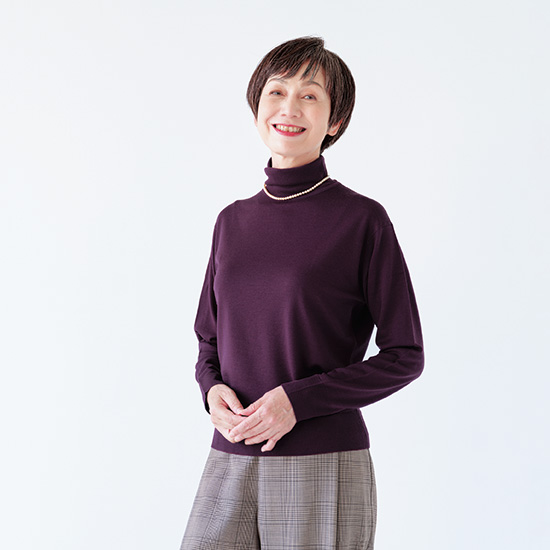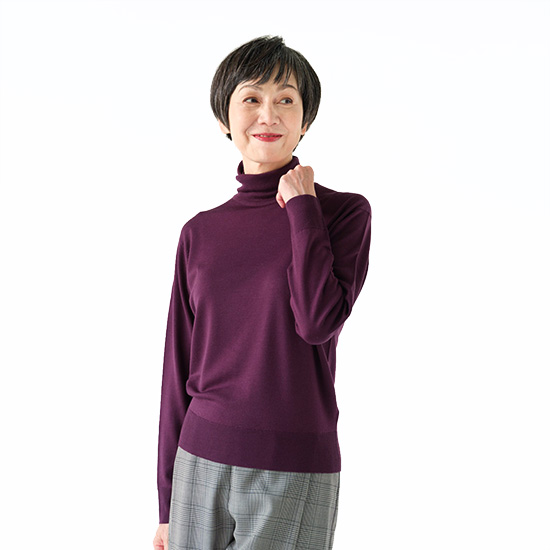 詰まり気味のタートルや、ちょっと下がった肩のラインがエレガント。 /ダムソン