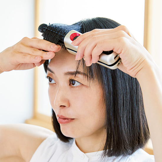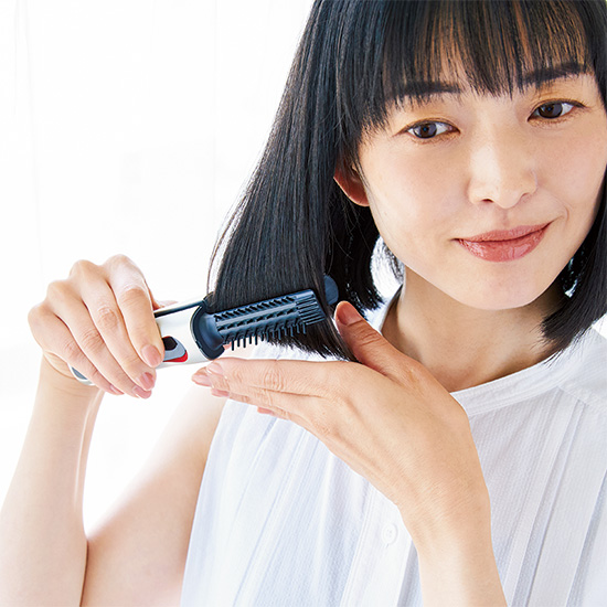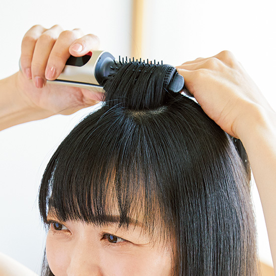 【ブラシ→ボリュームアップ】毛束の内側から根元にブラシをあて、引き抜きます。短いピンが髪をとらえ根元がフワッ。