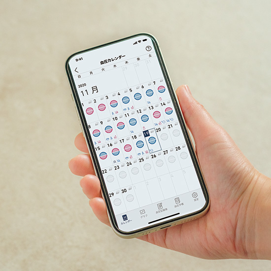 アプリの血圧管理機能で表示。毎日の数値を知ることは健康への第一歩。