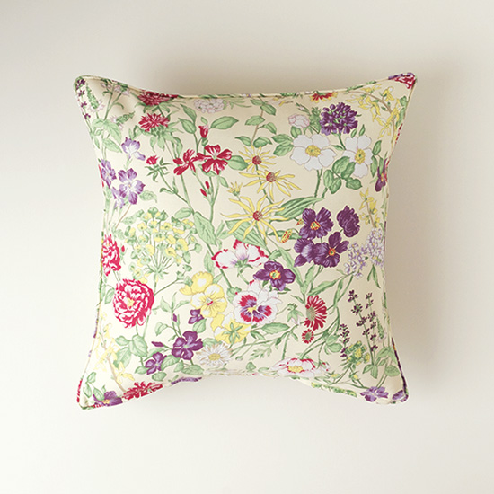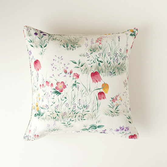 みずみずしい草花を描いたファブリックがクッションカバーになりました