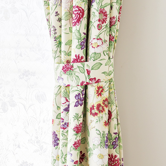 花柄カーテンには共布のプレーンなタッセルが付いています。
